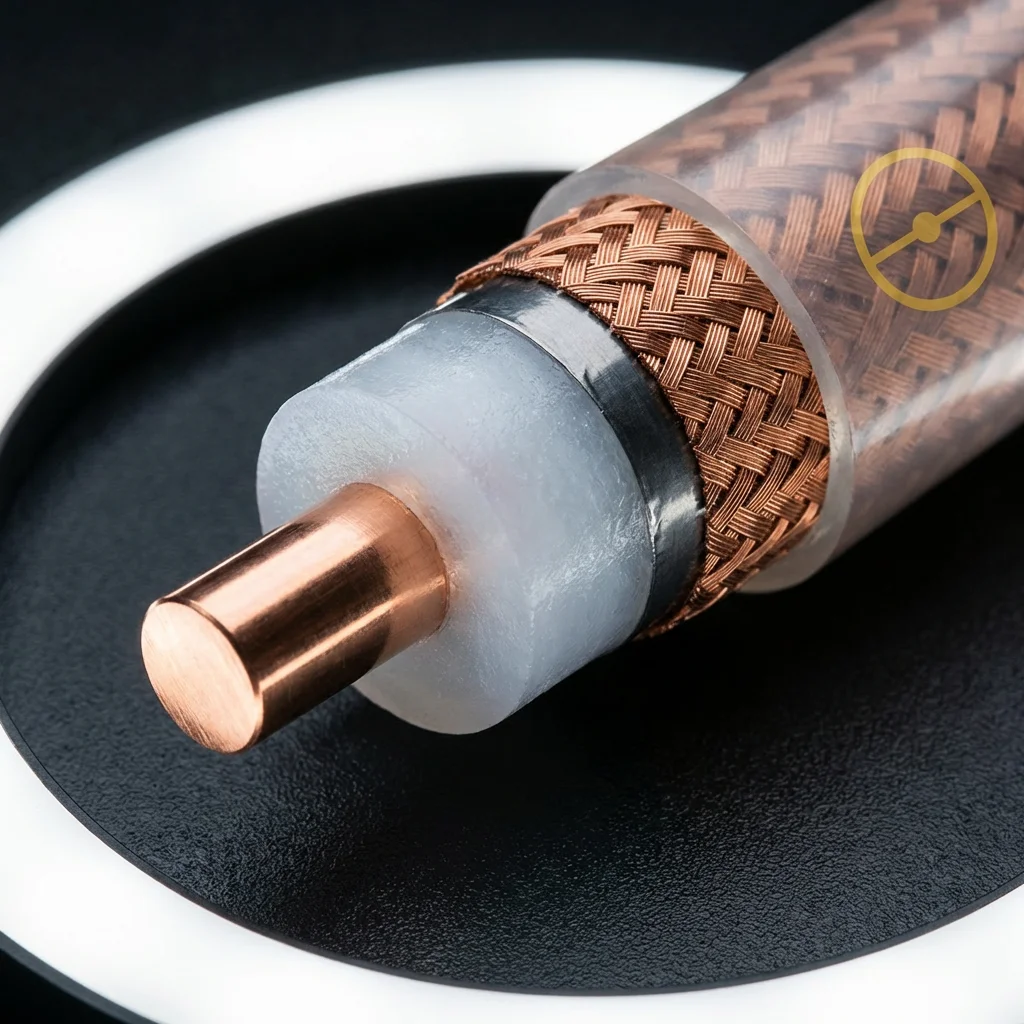 The triple-symmetrical geometry extends the dual-hemisphere principle of the Meridian by adding a third conductor axis, creating a three-dimensional electromagnetic cancellation topology that rejects residual bias along all spatial planes simultaneously. The cryo-treated nitrogen PTFE dielectric has been held at minus 196 degrees Celsius for 72 continuous hours, a process that permanently restructures the polymer’s molecular alignment and eliminates the charge memory that plagues untreated dielectrics. The Mylar/Kevlar composite jacket provides mechanical stability and moderate electromagnetic shielding without adding the weight of metallic shielding layers.