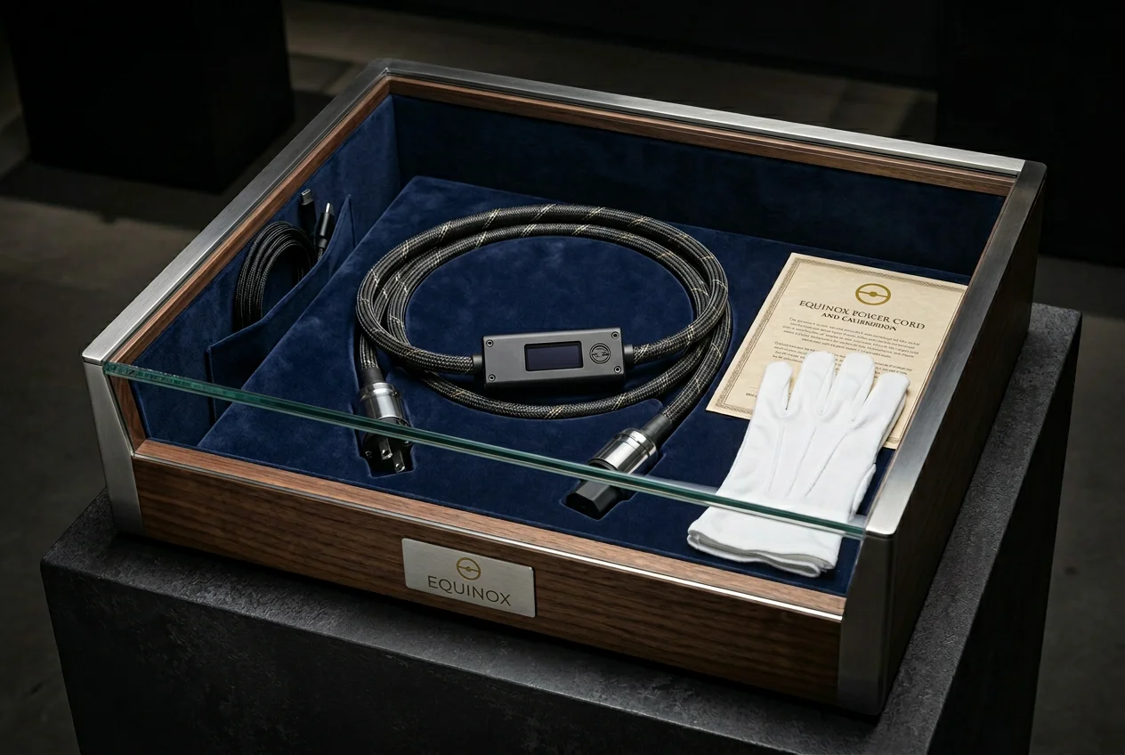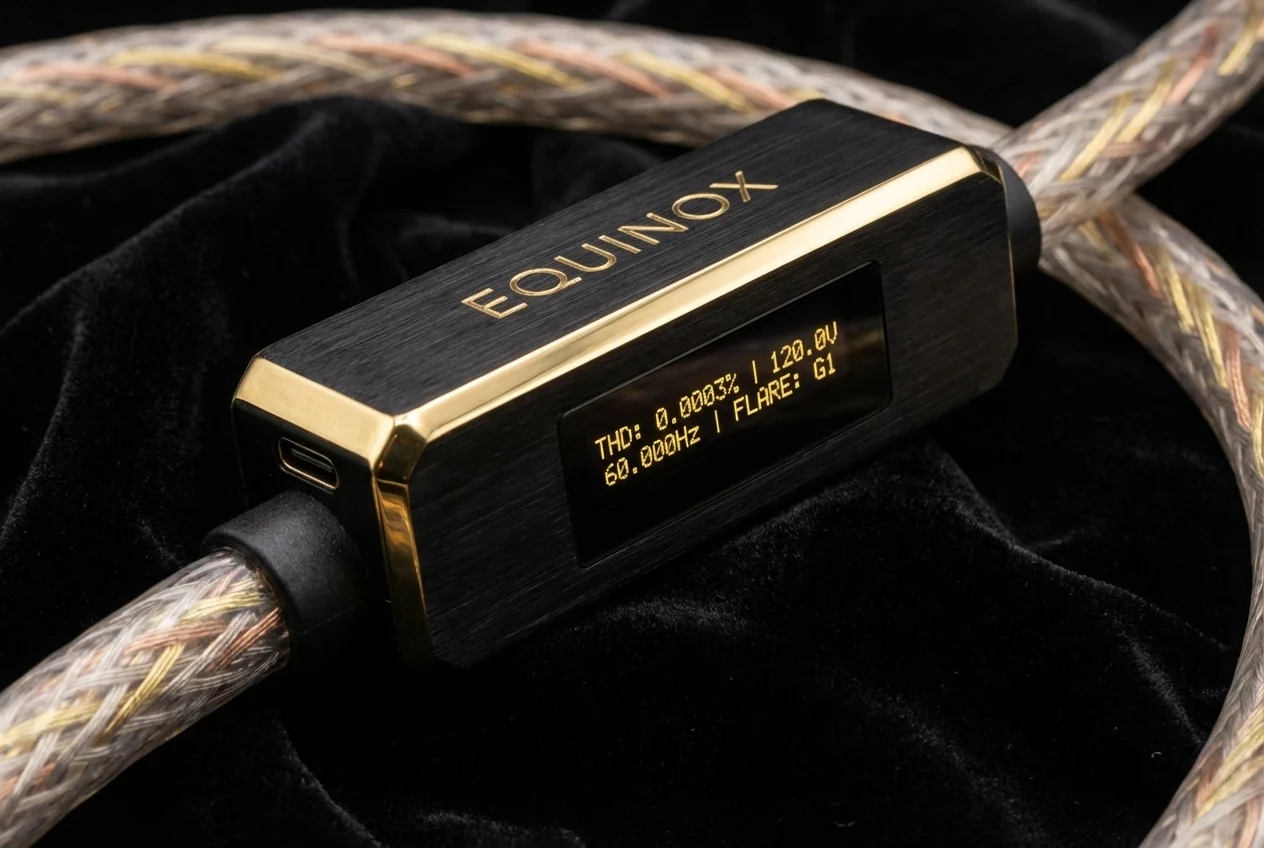 The conductor is single-crystal OFC: copper drawn as a continuous monocrystal with zero grain boundaries along its entire 1.5-meter length. This eliminates the micro-diode effects that occur at grain junctions in conventional polycrystalline copper and provides the lowest possible resistive path for current delivery. The semi-translucent fluoropolymer jacket reveals the triple-layer shielding beneath — mu-metal, copper braid, and conductive polymer — which serves as the passive foundation upon which the active cancellation operates. Surgical steel connectors with gold-plated contacts provide a termination that is both mechanically indestructible and electrically ideal. USB-C firmware updates are released quarterly, each incorporating updated noise profiles calibrated against the latest grid conditions and solar cycle data. The 300-hour break-in period is partially automated — the DSP continuously calibrates its cancellation algorithms during this period, converging on an optimal profile for your specific electrical environment.
