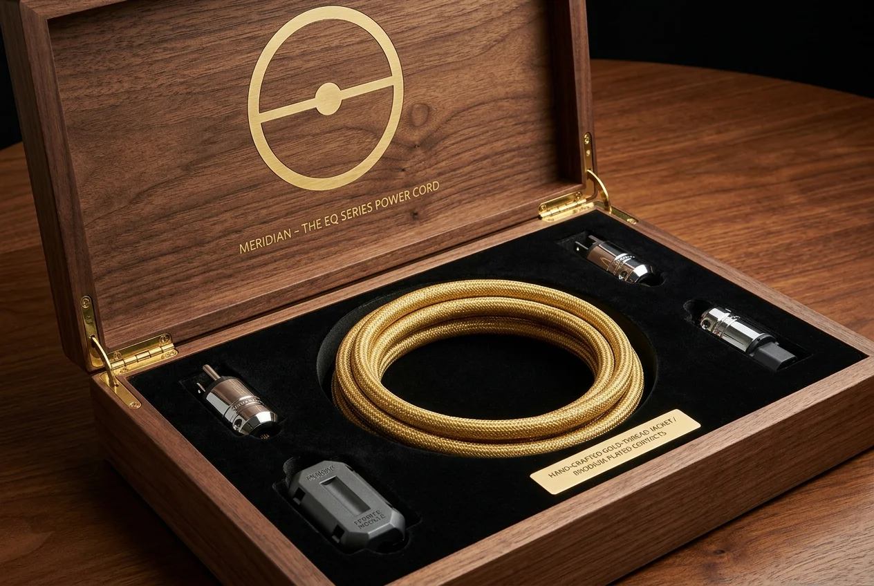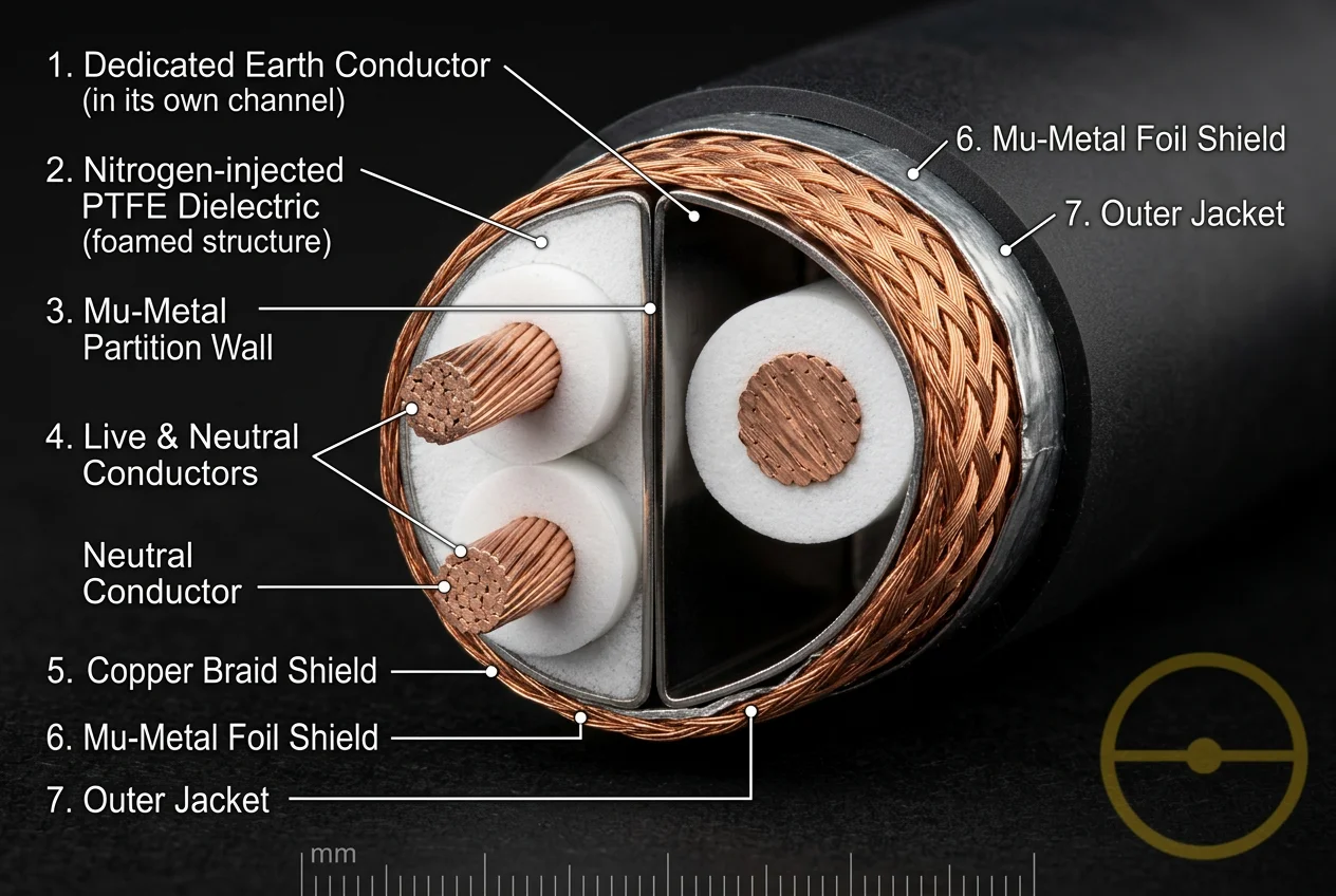 The earth conductor in a standard power cable shares the same jacket, the same air space, and the same electromagnetic environment as the live and neutral conductors. This means that every noise artifact on the earth line — every ground loop, every common-mode current, every millivolt of potential difference between your equipment chassis and the building ground rod — is physically coupled to the conductors carrying your audio signal’s power. The Meridian Power Cord eliminates this coupling by routing the earth conductor through its own dedicated channel, physically separated from the signal conductors by a mu-metal partition wall. The earth is still connected. It simply no longer contaminates the power delivery path.