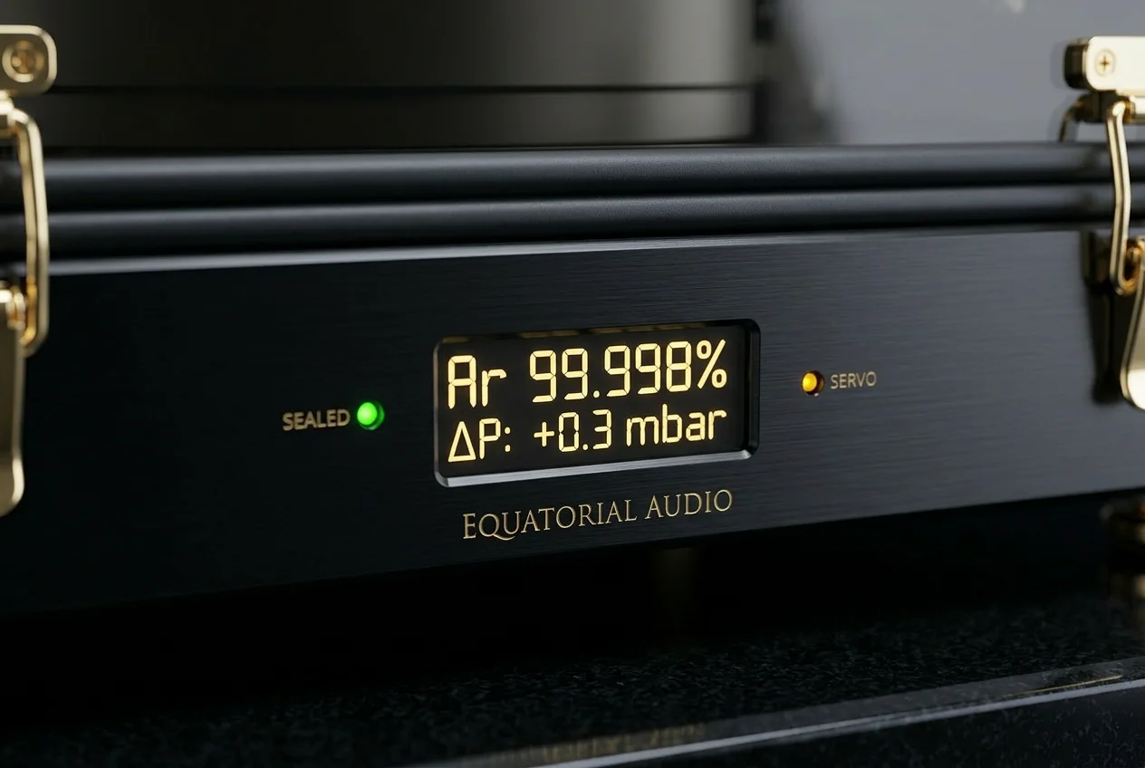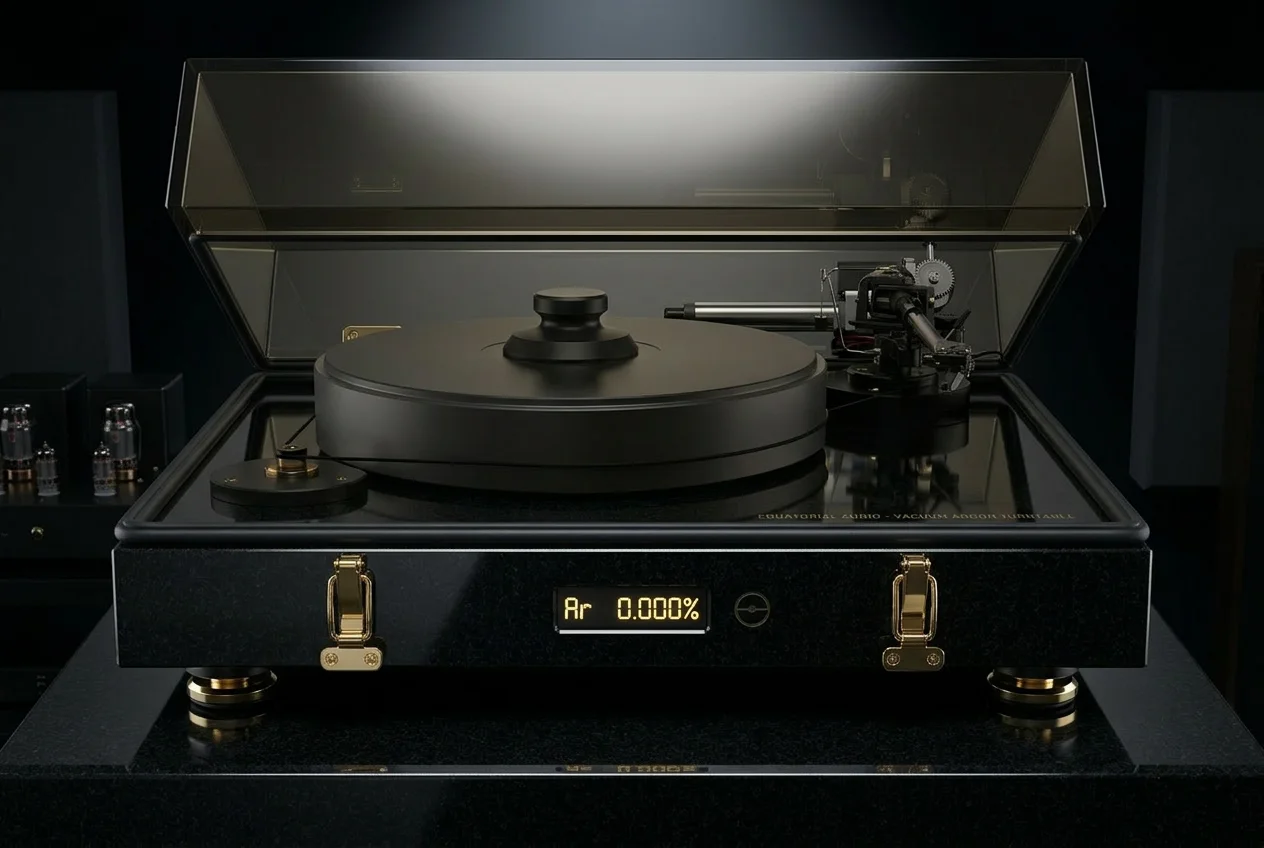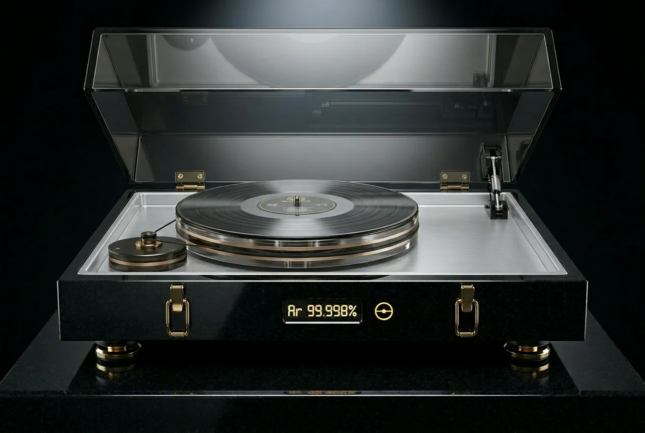 Air is the enemy of precision mechanical systems. The atmosphere surrounding a turntable platter introduces aerodynamic drag that varies with temperature, humidity, and barometric pressure, creating speed instabilities that no servo system can fully correct in real-time. Air also transmits acoustic energy from your loudspeakers directly to the record surface, creating a feedback path that colors the sound with room-dependent resonances. The Vacuum-Argon Reference Turntable addresses both problems by replacing the air around the platter with argon — an inert noble gas with superior aerodynamic properties — and sealing the bearing in a hard vacuum.
